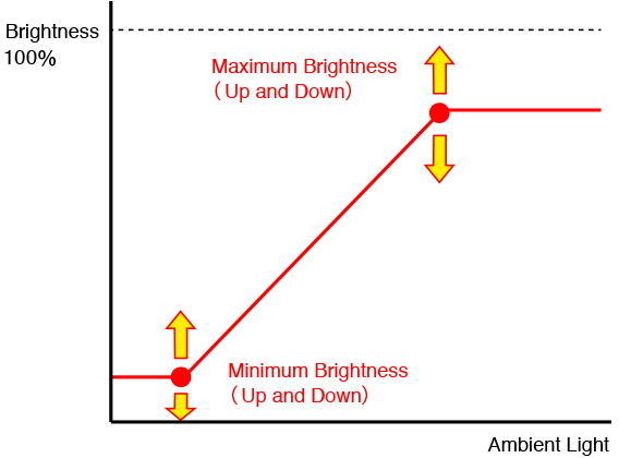 Set the monitor brightness for bright and dark environments separately. Adjust the Maximum Brightness for bright environments and Minimum Brightness for dark environments. (Refer to the chart below.)